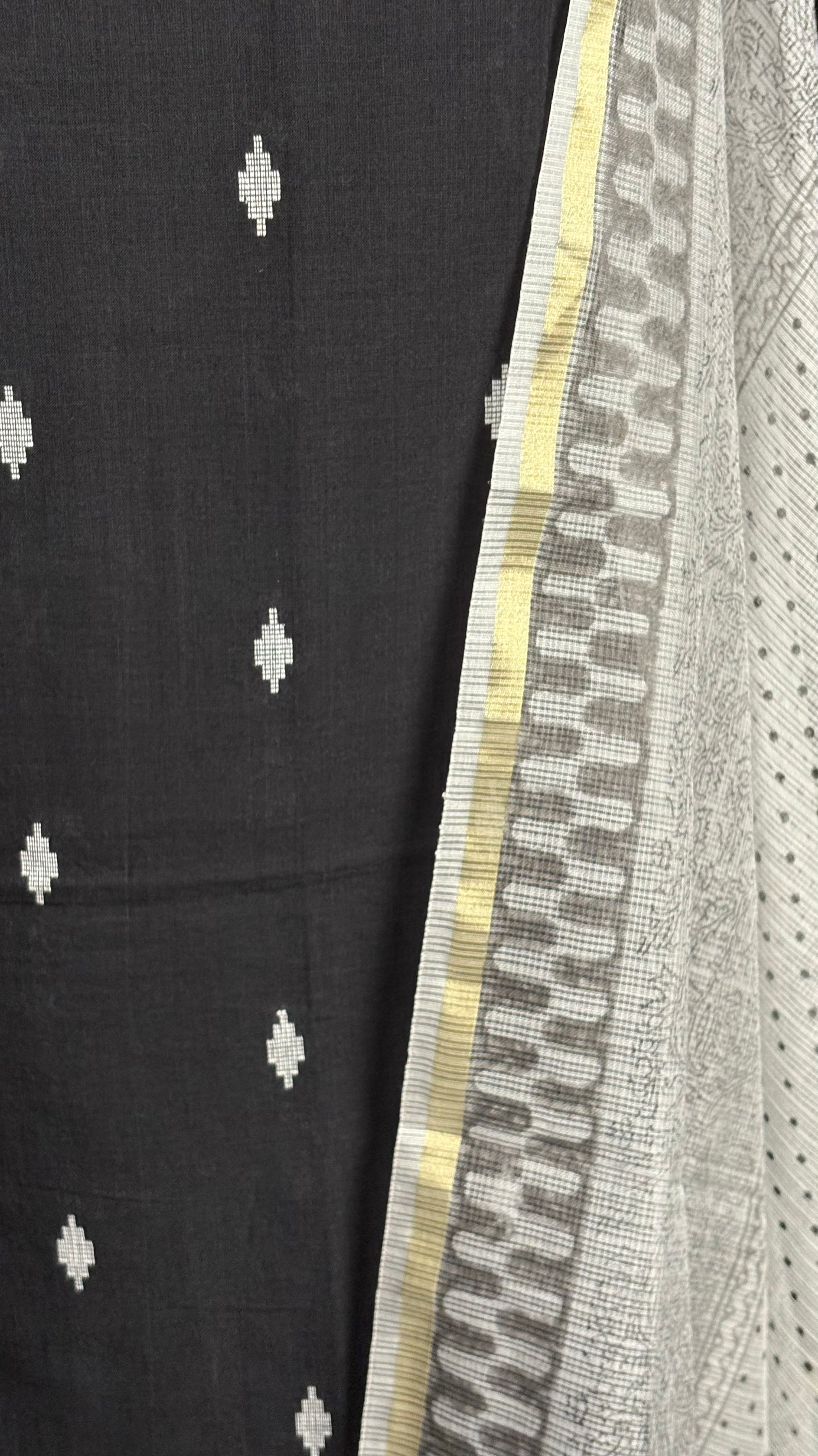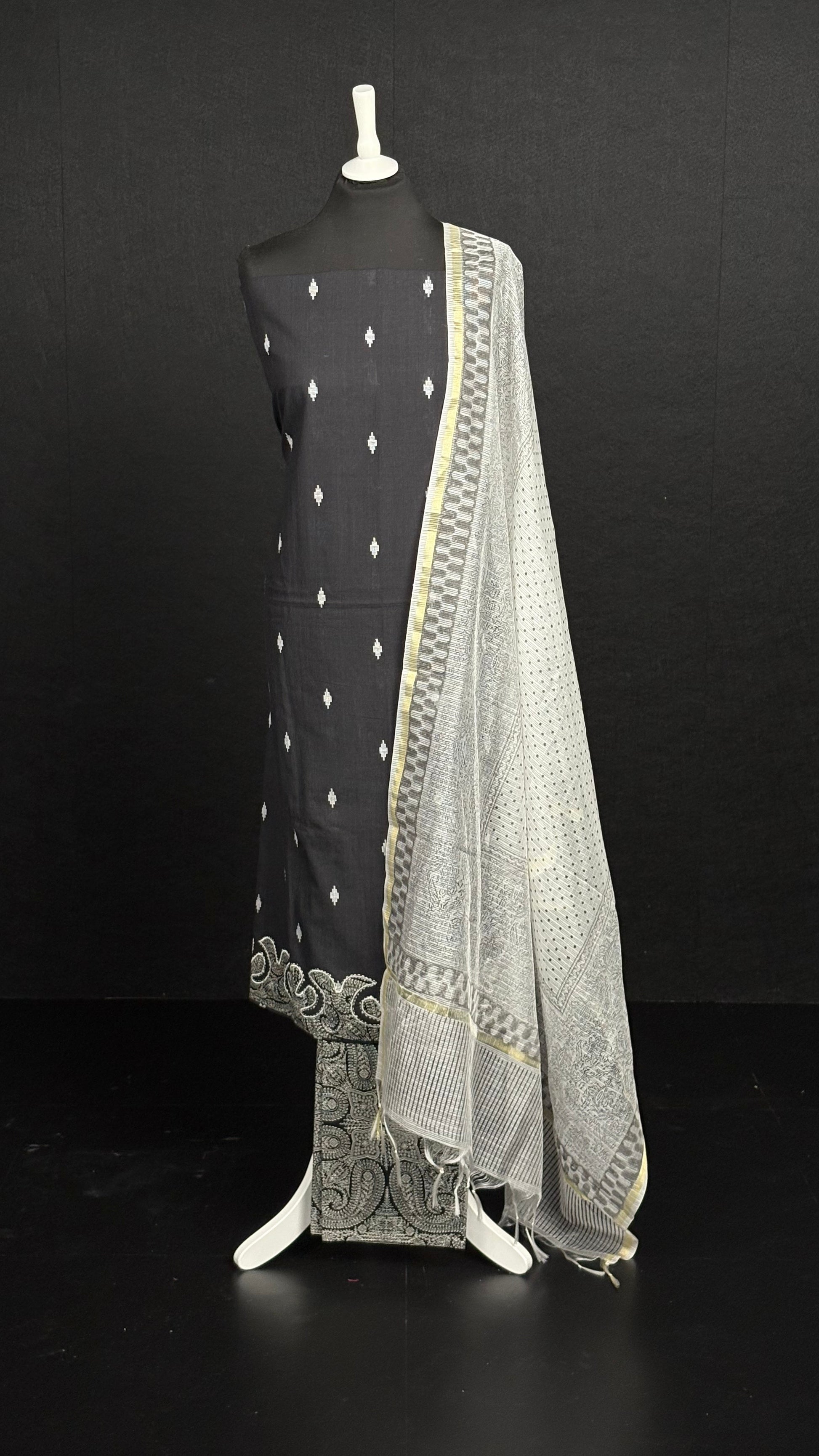 Unstitched cotton ikat kameez featuring refined threadwork detailing along the border. The textured ikat weave adds a handcrafted, timeless feel.